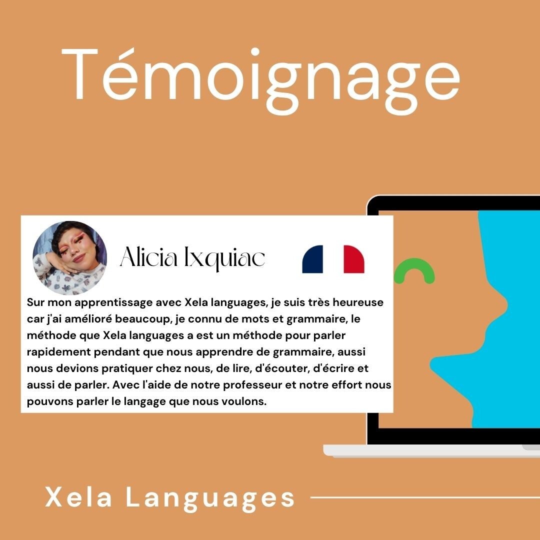"Siempre quise aprender de manera practica, gracias a las actividades del curso y las clases muy practicas, mejoré mucho mi francés, gracias Xela Languages."